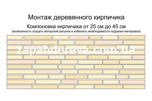 Великий вибір розмірів: ширина дерев'яного цеглинки варіюється від 25 см до 45 см – це дозволяє розподілити шви у розбіг при стикуванні. Тому не залежно від того, яка довжина стіни – ви зможете зробити монтаж взагалі без підрізування матеріалу.